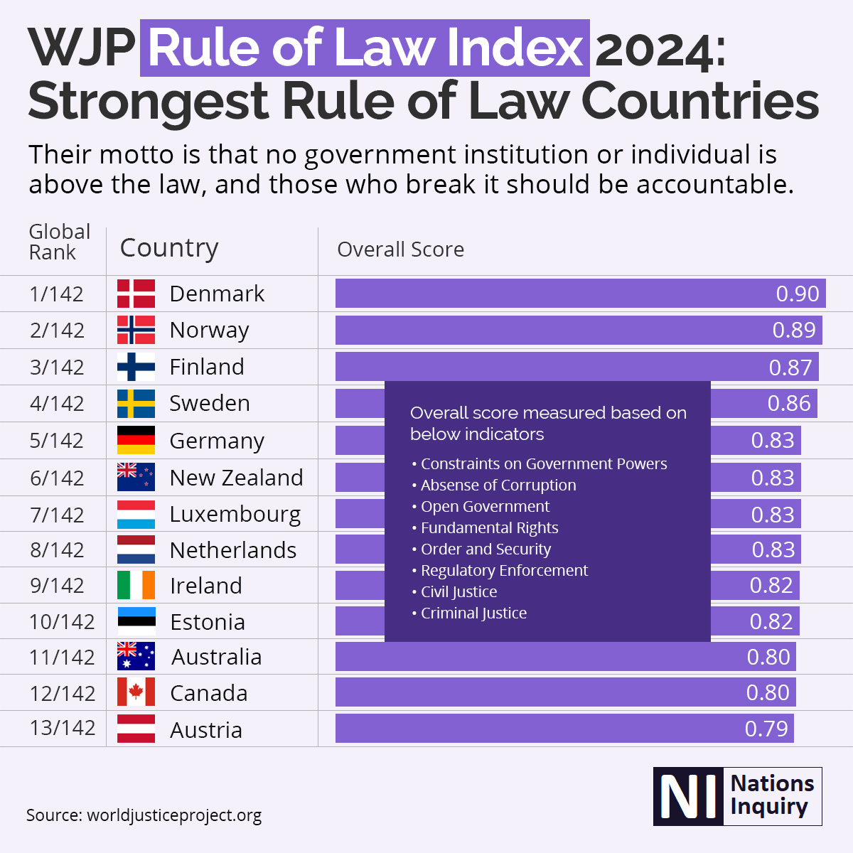 | GLOBAL RANK | Countries | OVERALL SCORE | Government Powers | Absence of Corruption | Open Government | Fundamental Rights | Order and Security | Regulatory Enforcement | Civil Justice | Criminal Justice |
